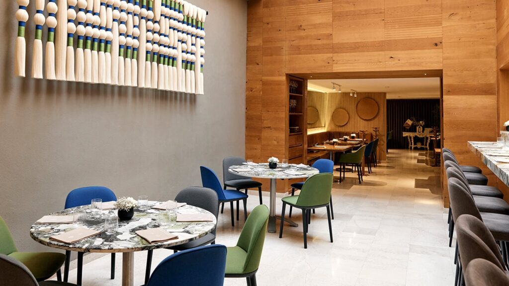 Otro proyecto emblemático es el restaurante Tickets en Barcelona, diseñado por el renombrado interiorista Lázaro Rosa-Violán. Este espacio, que refleja el concepto de tapas de alta cocina de los hermanos Adrià, mezcla de forma única lo vintage y lo contemporáneo, creando un ambiente lúdico que complementa la innovación gastronómica. El uso de luces focalizadas, texturas eclécticas y materiales industriales contribuyen a una atmósfera envolvente y dinámica.