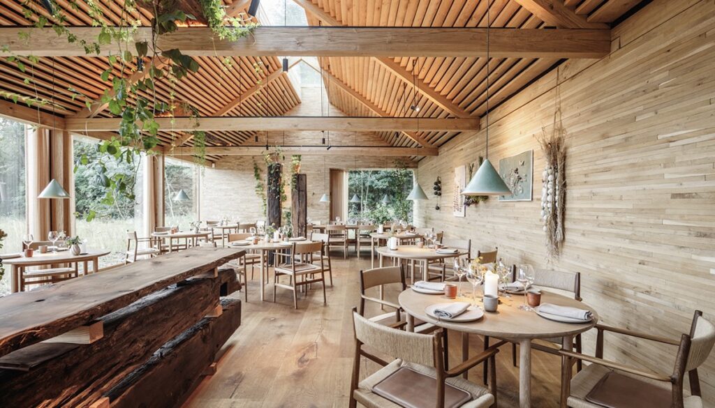La sostenibilidad es otro valor creciente entre los consumidores, por lo que la incorporación de elementos naturales y ecológicos puede atraer a un público preocupado por el medio ambiente. Sin embargo, tal como sugiere Bassat (2000), estos elementos deben ser coherentes con la imagen del local y no verse como una moda pasajera, sino como parte de una estrategia integral que aporte autenticidad. El Restaurant Azurmendi en el País Vasco, diseñado por Naia Eguino, es un referente en sostenibilidad, ya que cuenta con jardines verticales, sistemas de aprovechamiento energético y materiales reciclados en su diseño, alineándose con la filosofía del chef Eneko Atxa de sostenibilidad y respeto por el entorno.