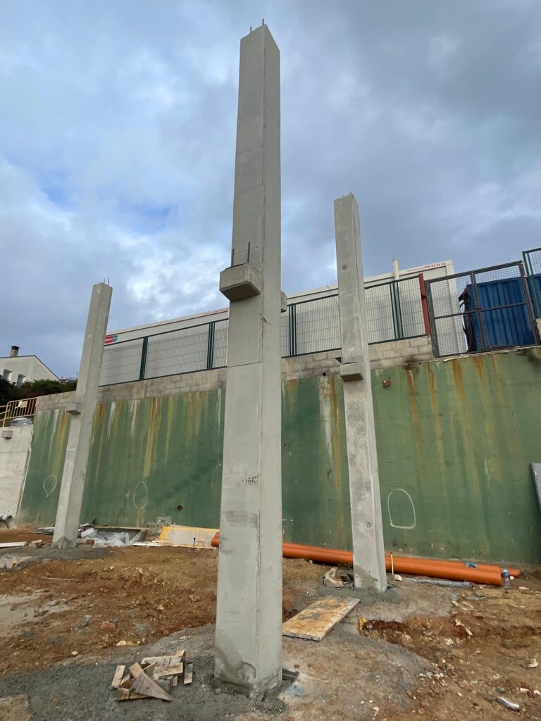 Es muy interesante ver cómo ubican los pilares directamente con una grúa móvil y se fijan a los anclajes.